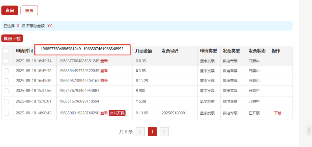 - 看到"查看"标识?说明多个商城订单合并开票;