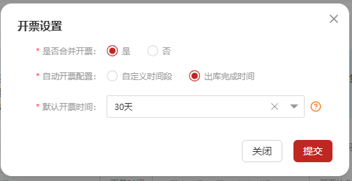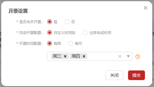 2、订单确认收货后,将开放“申请开票”入口,在此期间您可自定义开票的时间段,例如:每周四/每月25号自动开票(不配置则会根据出库完成时间30天后自动开票);