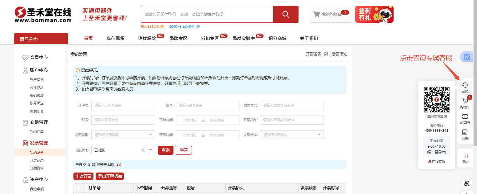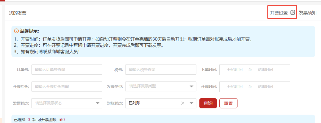 申请开票:勾选已发货的商城订单号即可申请开票;