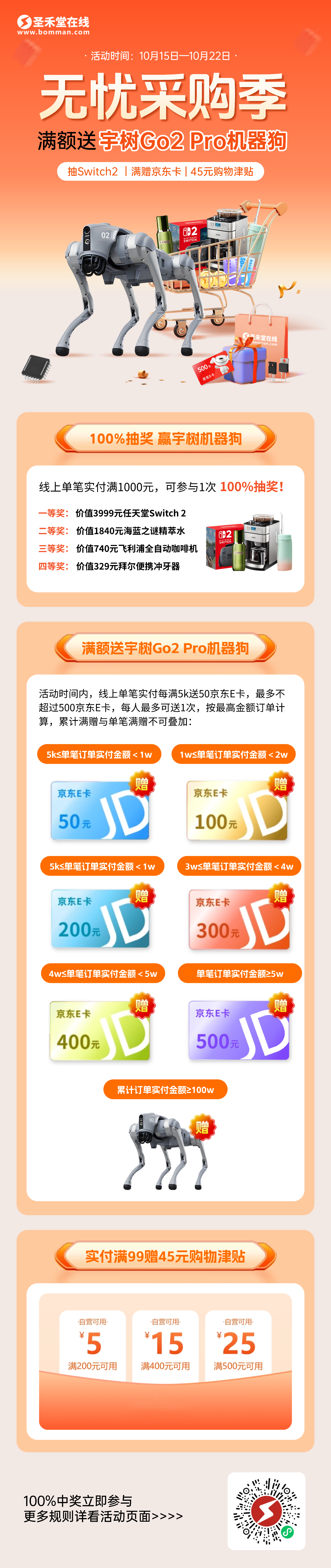 来圣禾堂在线采购电子元器件,就有机会带回超酷科技大奖——宇树Go2 Pro机器狗,还有任天堂Switch2、海蓝之谜精萃水、京东购E卡、咖啡机、净水器等豪礼等你拿~100%中奖!(详细活动如图所示)