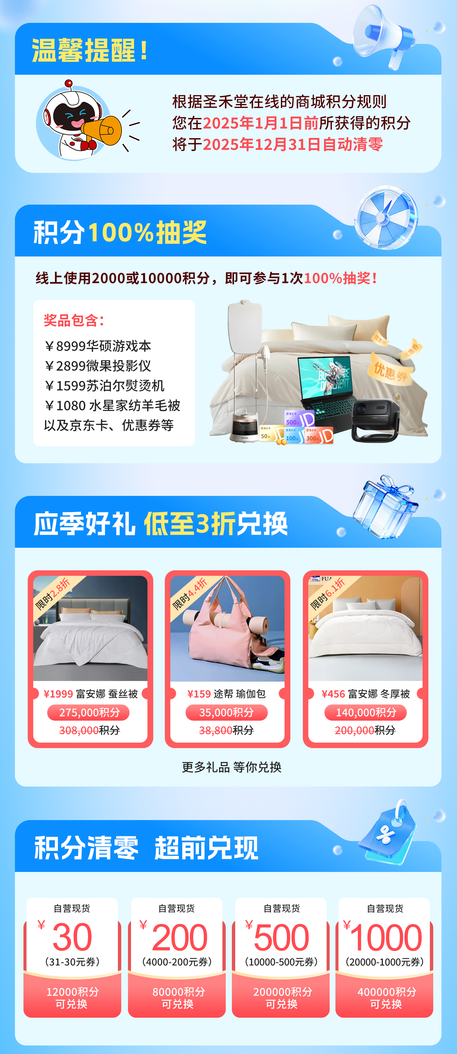 1、礼品若为京东E卡,将以等额积分值的形式赠送,中奖用户可自行前往圣禾堂商城积分兑换-圣禾堂在线页面,用积分兑换京东E卡,积分有效期至2026年12月31日;