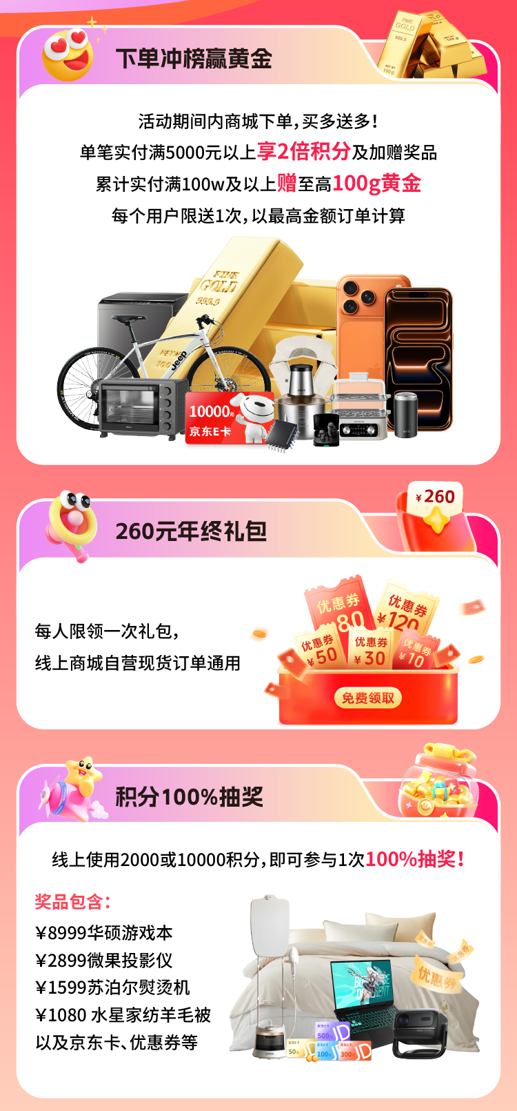 二、满额双倍积分加赠 足金黄金100g/1万元京东E卡/iphone17 PRO MAX 256g