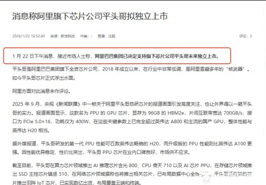 1月22日,阿里巴巴集团支持旗下芯片子公司“平头哥”未来独立上市的消息在资本市场与科技界引发广泛关注。虽然具体上市时间尚未明确,但市场已迅速作出积极反应——当日阿里巴巴美股盘前股价上涨逾5%。