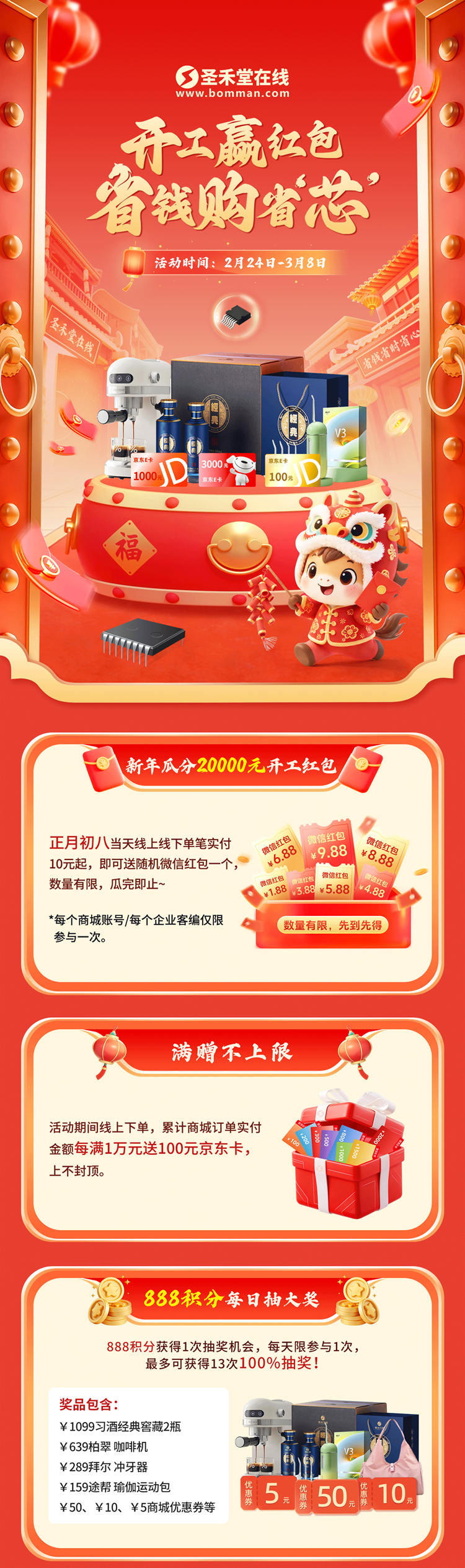 1、参与方式:活动时间内,用户在圣禾堂在线商城(www.bomman.com)、“圣禾堂在线”小程序下单,且订单在2026年3月13日23:59前进入“已发货”及后续状态,累计订单实付金额每满1万元送100元京东卡,上不封顶,每人每个账号仅限参与一次,同个公司多个账号不可跨号累计;